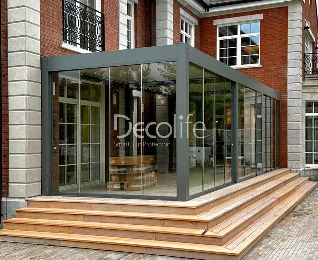 Пергола тентовая Decolife Project Light + Подъемное остекление W500 - реализовано партнером "ООО Люкс Террас" - Московская обл.
