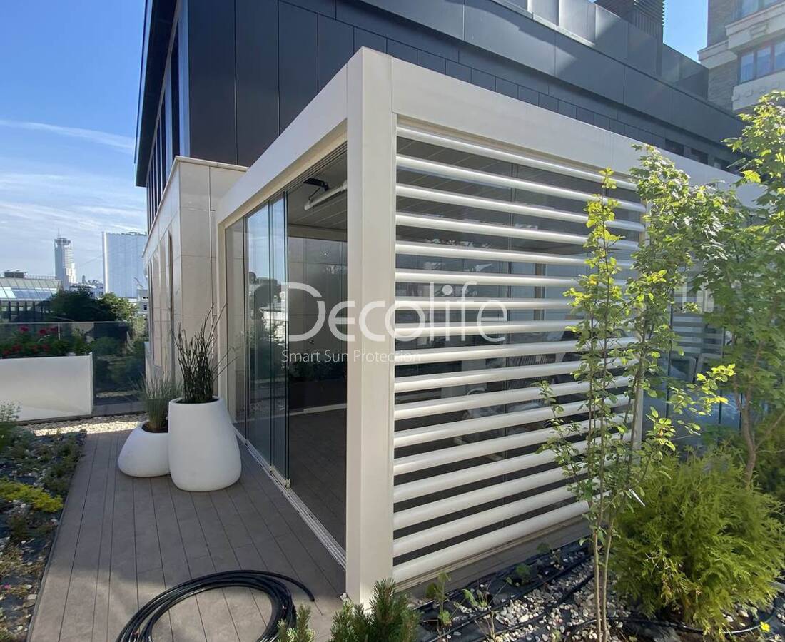 Пергола Decolife Bioclimatic B500-20C + Раздвижное остекление S100 + Фасадные жалюзи FZ44, реализовано партнером "ООО Люкс Террас" - г. Москва, Озерковская набережная